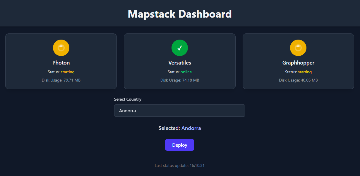 I want managing the stack to be as simple as possible, so I'd like to have a central management panel to configure the countries (or regions) for downloading files, importing data, restarting services, and so on.