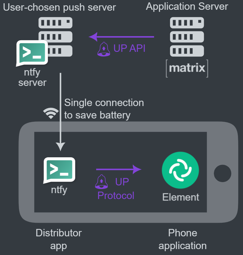 - The element app tells the matrix server "please notify me using this unified push endpoint with the following topic name"
